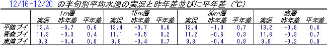 12月20日の日平均水温は、平舘ブイの全層で13.1〜13.2℃、青森ブイの全層で10.8〜11.4℃、東湾ブイの全層で9.7〜9.8℃となりました。
