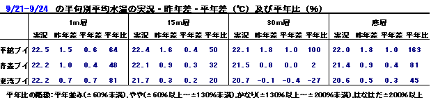 9月21日〜24日の水温を半旬別平均水温として平年と比べると、平舘ブイでは1m層と30m層が【やや高め】、15m層が【平年並み】、底層が【かなり高め】、青森ブイでは1m層〜30m層が【平年並み】、底層が【やや高め】、東湾ブイでは1m層が【やや高め】、15m層〜底層が【平年並み】でした。