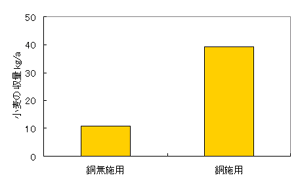 一般的に、小麦は土壌中の0.1N塩酸可溶性銅が0.5ppm以上では、欠乏による不稔症状が発生しないことが明らかになっています。試験の結果、可溶性銅が0.8ppm~0.9ppmのほ場では欠乏による不稔症状が発生せず、0.2ppmのほ場では発生することを確認しました。また、平成17年度に可溶性銅が0.2ppmのほ場において、土壌に銅施用を実施し銅含量の矯正を行うことによって、不稔症状が回避されることを確認しました。