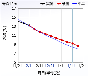 これまで観測した実測値(黒線)と今後の予測(赤線)、平年値(青線)で示しています。予測の色が薄い部分は過去のデータとの検証で誤差がやや大きい(RMSE>1.0)部分です。